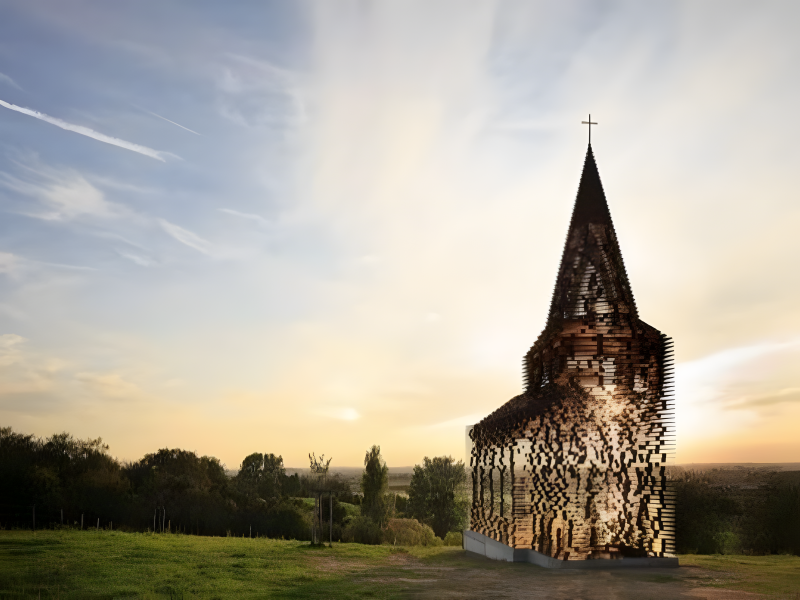 The construction of this church took place in 2011. The dome is approximately ten metres tall from bottom to top. Steel components were used as building materials for the temple. Horizontal metal plates are stacked to provide a solid from one angle and a semi-transparent openwork silhouette from another. The church appears to be hovering in midair.