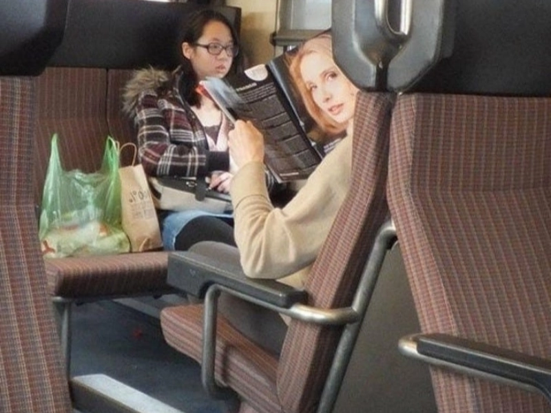 Potresti avere la strana impressione di essere continuamente osservato sul treno. La tua visione periferica, che è diventata improvvisamente acutamente consapevole, lo capta. Prima di iniziare a sentirti a disagio, prenditi un momento per guardare indietro e vedere come la pagina della rivista crea l’impressione che qualcuno stia sbirciando dietro il sedile. Per fortuna non è una stalker.