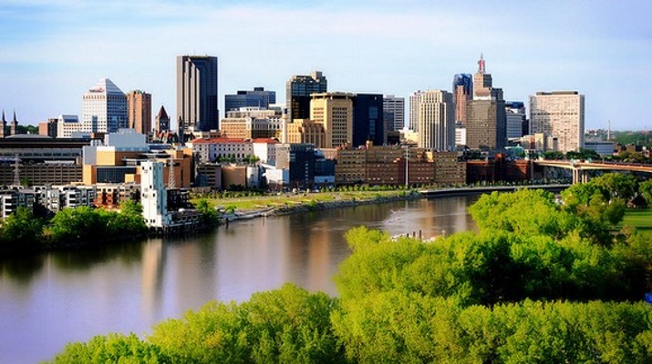 Minneapolis, Minnesota. Minneapolis is located on the banks of the Mississippi River and is considered one of the “green” in the States. Green massifs in the city occupy about 15% of the territory.