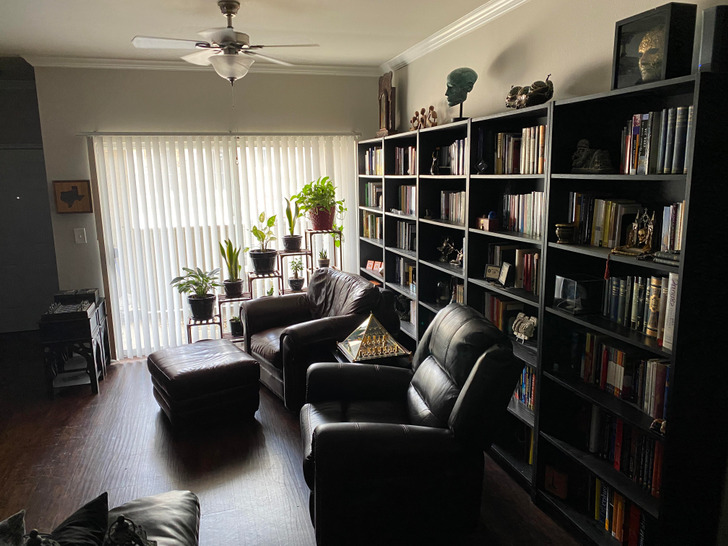 “Since I only had one bed and one bathroom, I had to arrange five of the seven bookshelves behind my chairs. I’m extremely happy with how it came out. Although there aren’t any skylights, the sliding glass door lets in a lot of natural light. I wish I could paint the walls at the complex.