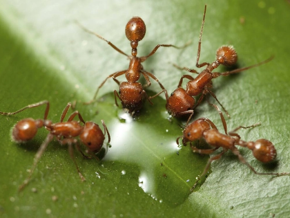 When confronted with floods, fire ants exhibit an amazing survival tactic. Entire colonies can join their bodies together to create a live raft able to float for weeks during flooding situations. Thousands of ants linked via their legs and mandibles form this amazing structure, which creates a water-resistant surface shielding the queen and larvae in the middle. The ants rotate constantly to make sure none of one ant stays buried for too long. These rafts can sustain their buoyancy for up to two weeks, according to scientists, and their construction is so effective that they repels water more than many synthetic waterproof materials. One of the most successful invading species worldwide, fire ants have survived and expanded over flood-prone areas thanks in great part to their amazing adaptation.