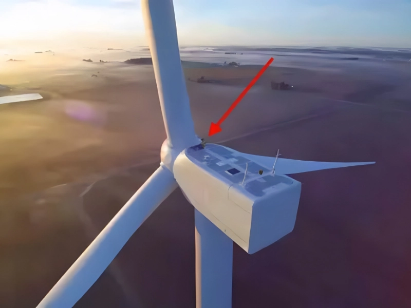 The tiny man you can hardly see standing atop a wind turbine is the target of this red arrow. This striking picture serves as a stark reminder of our smallness in comparison to our own creations.
