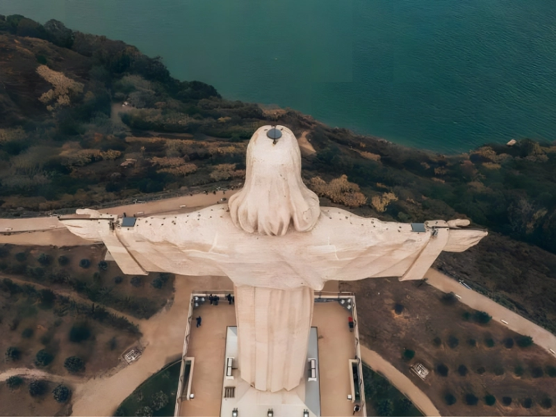 One of Lisbon, Portugal’s most notable attractions, is Christ the King, a massive monument to Jesus Christ. The shrine and monument are seen in this picture taken from the top of Jesus’ head, demonstrating the statue’s over four hundred-foot height.