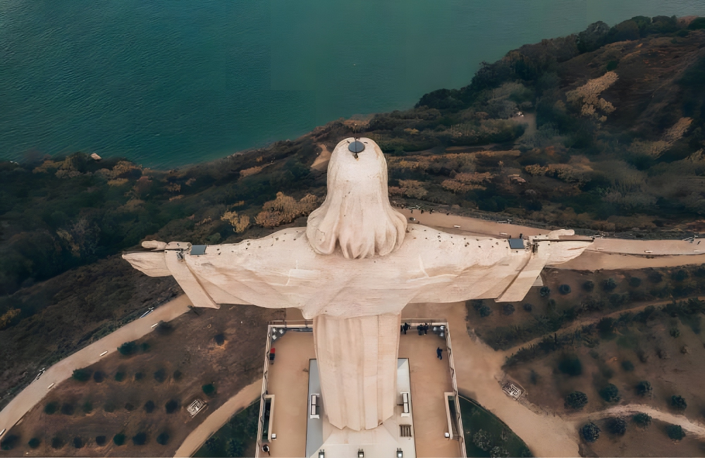 Those who visit Lisbon, Portugal can’t miss one of its largest features: Christ the King, a huge statue of Jesus Christ. This image shows the shrine and monument from the top of Jesus’ head, showcasing how high this almost four-hundred-foot-tall statue is.