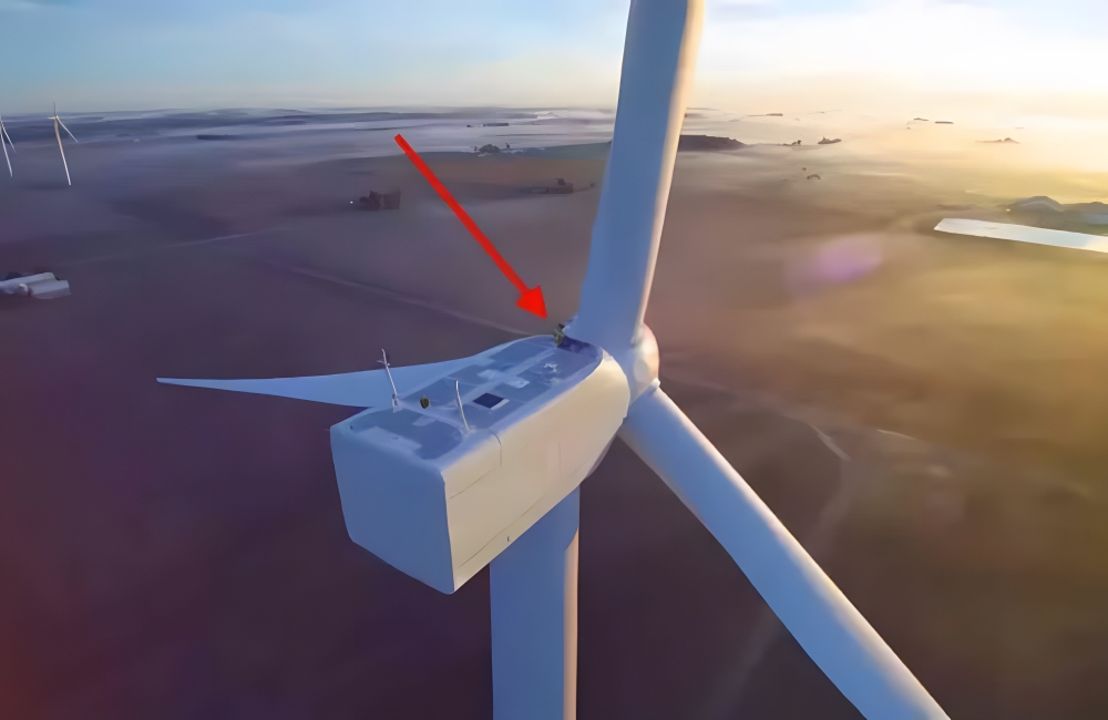 This red arrow is pointing to a man standing atop a wind turbine, and the man is so small, you can barely see him. This image is jarring, reminding us of how tiny we are against our own creations.