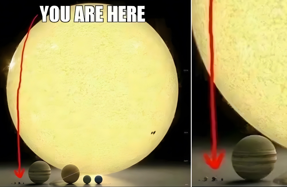 This image really puts things into perspective, showcasing the massive might of the sun as compared to planets like ours. The sun is a huge, glowing ball that keeps us alive (and can sometimes cause us issues like sunburn and solar flares, too).