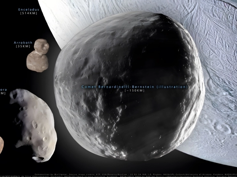 The Bernardinelli CometBernstein is the largest known Oort cloud comet, with a nucleus diameter of at least 75 miles. It is predicted to pass slightly outside of Saturn’s orbit in January 2031, but as it won’t enter the inner Solar System, it won’t be visible to the unaided eye.