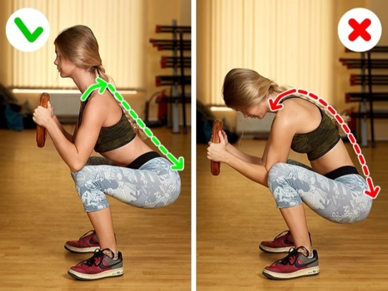 False: Your back is rounded because your shoulders are rounded forward. You add an extra load when you squat too low.Right: Tuck your shoulder blades together and reposition your shoulders. Keep your lower back slightly arched while maintaining a straight back. When squatting, your thighs must be parallel to the ground.
