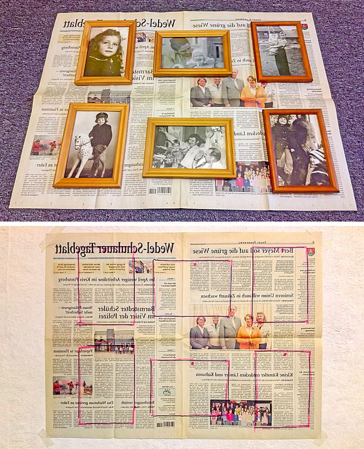 Place the frames on a newspaper sheet first so that when hanging a photo or painting collage, there are as few holes in the wall as possible. Using a marker, circle the frame boundaries and indicate the screw locations. Next, affix a paper template to the wall and use it to guide the drilling of fixation holes.