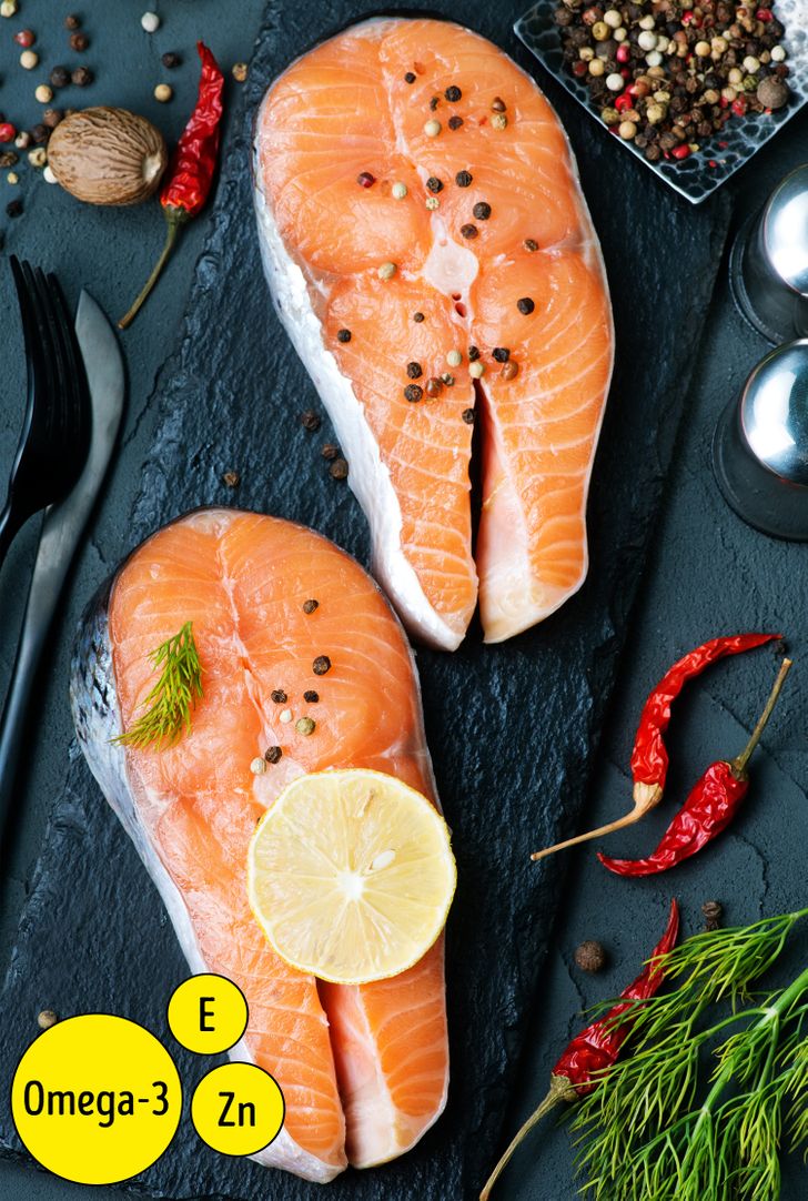 Fish that are high in omega-3 fatty acids (salmon, mackerel, herring, sardines, tuna) are essential for healthy glowing skin. Omega-3 fatty acids keep the skin supple and moisturized and reduce inflammation. These fish are also a good source of antioxidant vitamin E as well as zinc, a wound-healing mineral that helps get rid of acne and irritation.