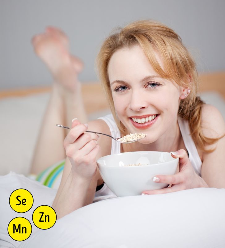 Oats are full of manganese — a mineral that’s not commonly associated with skin health. However, manganese helps your body absorb essential skin vitamins and minerals such as choline, biotin, and vitamin C. Together, they help preserve your skin’s elasticity and fight free radical damage. Oats also contain skin-healing zinc and antioxidant selenium.