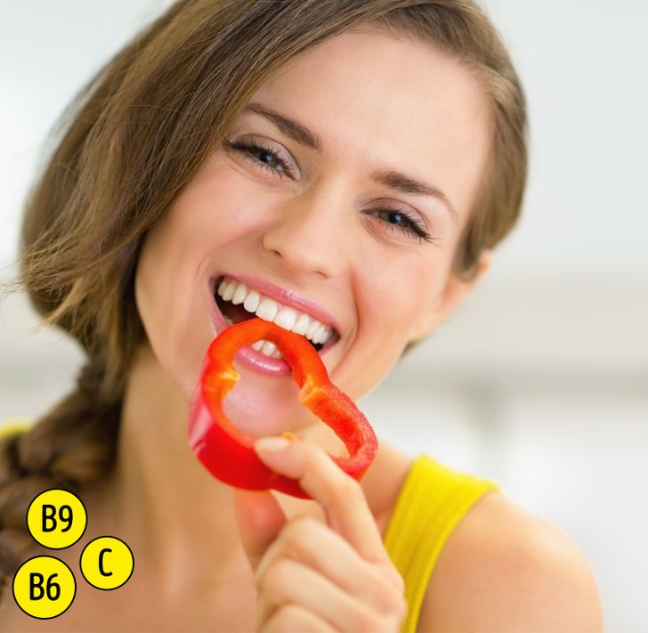 Out of all the fruits and vegetables, red and yellow bell peppers contain the most vitamin C. They’re also rich in skin-healthy vitamins B6 and B9 (folate), as well as carotenoids. B6 is known to prevent or fight such skin conditions as dermatitis, eczema, and hormonal acne, and folate improves the firmness of your skin.