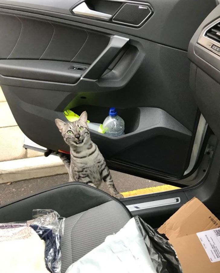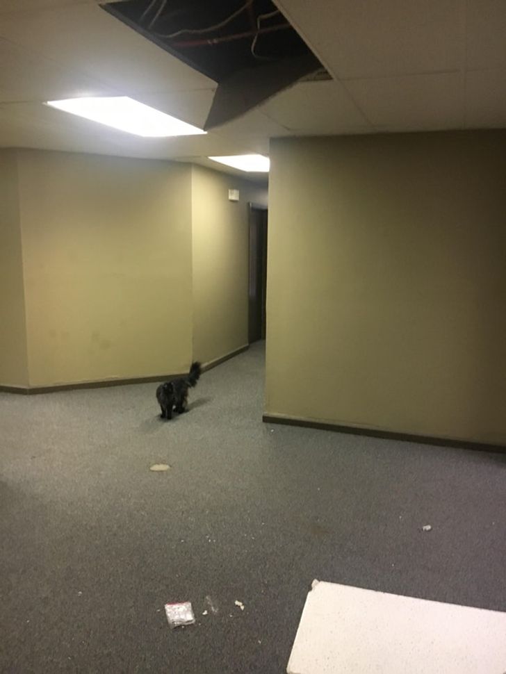 “This cat just fell out of the hallway ceiling in my apartment building.”