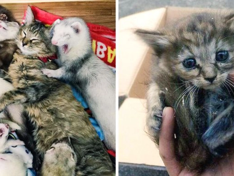 The household that discovered this stray kitten previously owned five male ferrets. The ferrets welcomed their baby sister with open arms and were overjoyed to have her. Despite being a little bigger today, Komari still prefers cuddling and sleeping with her brothers because she grew up thinking she was a ferret.
