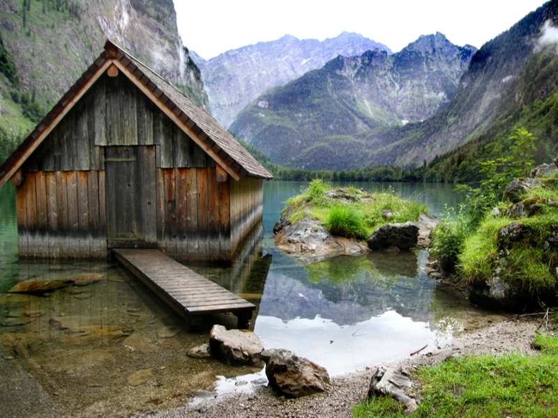 An ancient lakeside fishing cabin in Germany.