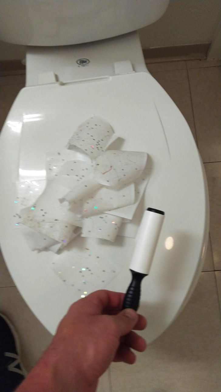 6. “$2 lint roller, and a few minutes on my knees. Kids bathroom is finally free of glitter.”