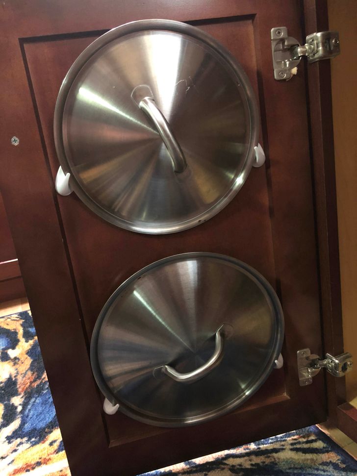 3. “I used Command hooks to hang my pan lids on the inside of my cabinet door.”