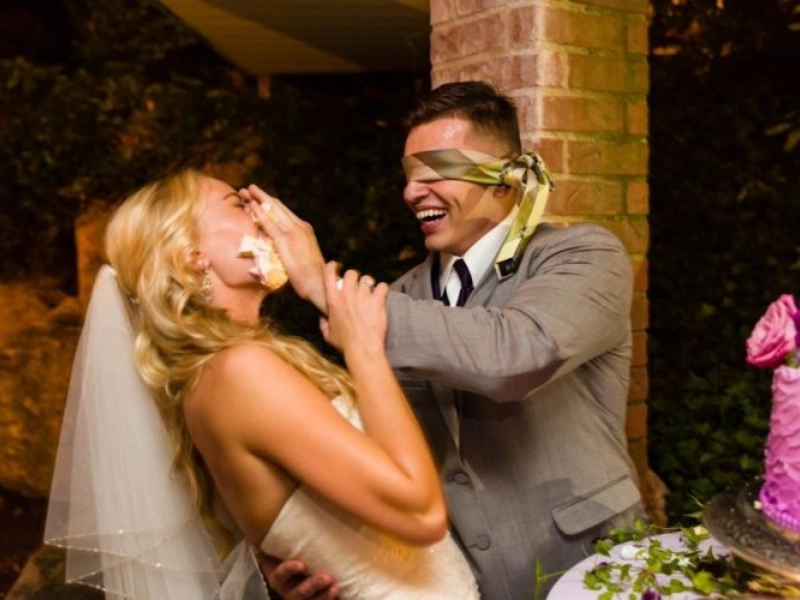 Der Bräutigam fütterte die Braut von ganzem Herzen mit einem Kuchen.