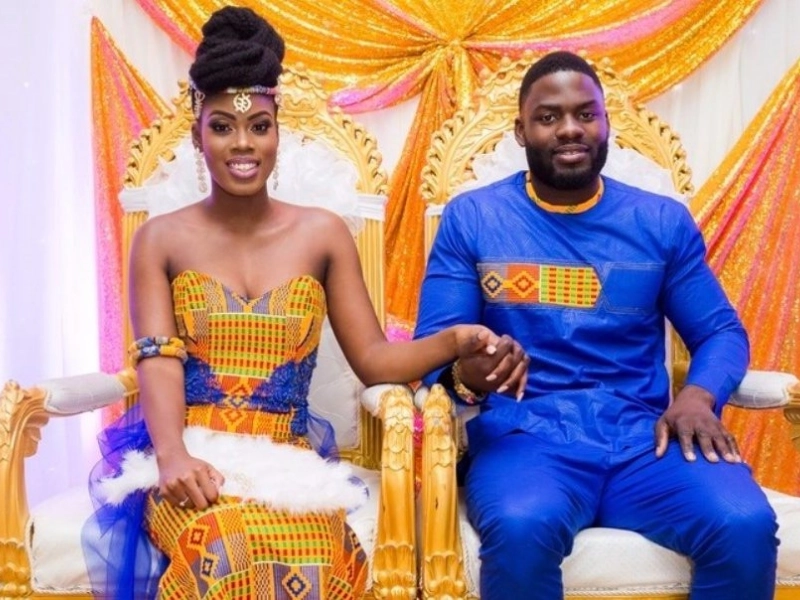 The colour gold is the key to Ghanaian wedding style. Traditional kente cloth, which is handwoven from silk and cotton strips to form beautiful patterns, is frequently used to tailor dresses. Ghanaian brides typically dress in gold and yellow hues. They wear a matching scarf made from the same handwoven fabric as the dress, which has lots of yellow hues, and adorn their heads with fabric or beaded headdresses.