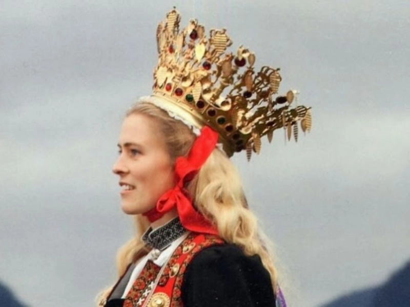 “Bunad” is the term for traditional bridal dresses in Norway. It is traditional to wear it on important occasions, like baptisms, in addition to the wedding ceremony. The headpiece, which is a vital component of the wedding attire, is a crown. In the past, the bride’s family’s financial situation would determine which priceless ornaments were placed on it.