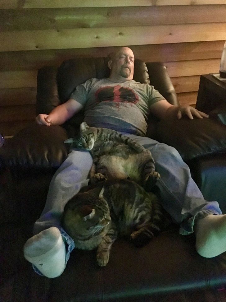 “One of our cats sleeps in the same position as my husband. They both fall asleep watching TV in the evenings.”