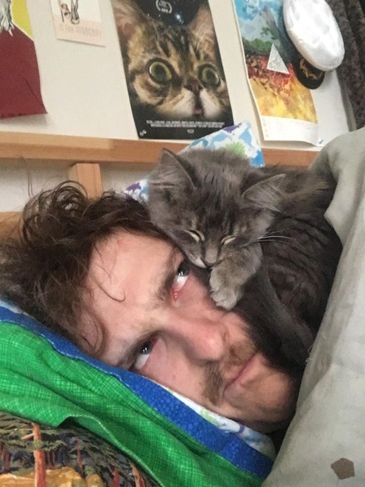 “My new cat only sleeps on my head. Meet Newt.”
