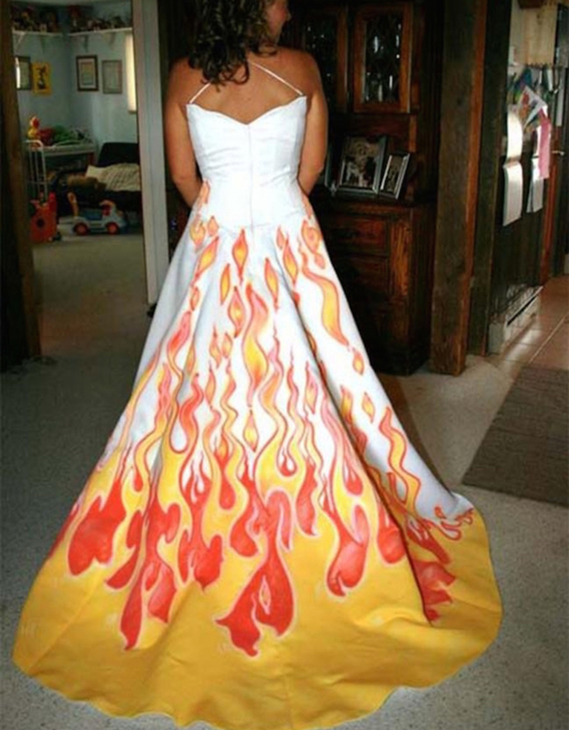 When thinking about this season’s most fashionable wedding dresses, many people picture designs featuring intricate beading, shimmering sequins, or innovative sleeve styles. These elements often dominate bridal fashion trends, shaping the standards for what is considered stylish. However, one bride chose to take a completely unexpected and unconventional route with her wedding dress. Instead of following traditional trends, she incorporated bold, spray-painted flames into her gown’s design, turning it into a striking and unforgettable work of art.