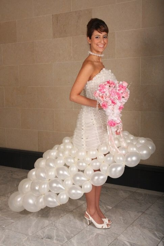 The craftsmanship behind this dress is nothing short of astounding. Each balloon was carefully selected and meticulously arranged to form the structure of the gown, creating a look that was both whimsical and surprisingly elegant. The soft, pearly sheen of the balloons gave the dress a bridal feel, while the intricate design showcased the incredible skill of the artist who brought this vision to life. Constructing a dress out of balloons is no easy feat, as it requires precision, patience, and an eye for detail to ensure the design holds together. Yet, the final result was a masterpiece of creativity and innovation.