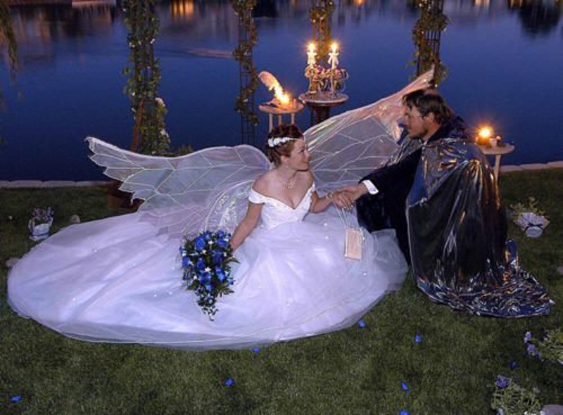 The ceremony was a visual spectacle, with the bride’s delicate wings and shimmering dress complementing the groom’s flowing robes and mystical staff. Together, they transported their guests into a world of fantasy, where love and magic intertwined. Every detail of the event, from the décor to the attire, reflected their shared passion for fairytales and their unique love story. It was a wedding that celebrated not only their union but also their shared imagination and creativity.