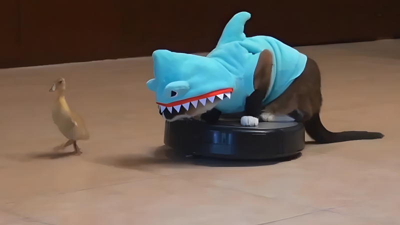Укротит робот-пылесос, нарядившись в костюм акулы (все коты делают это!).