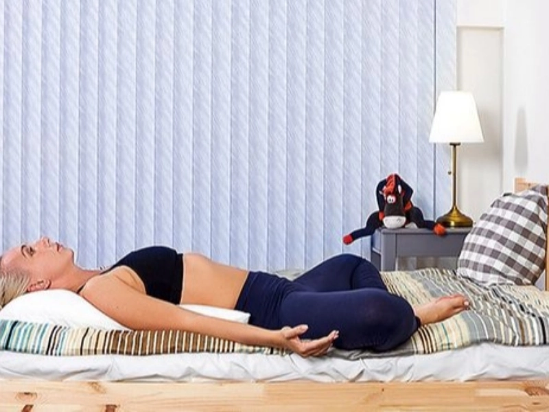So geht’s: Legen Sie sich bequem hin und legen Sie ein Kissen unter Ihren Rücken. Legen Sie Ihre Hände mit den Handflächen nach oben seitlich ab und spreizen Sie Ihre Beine leicht. Stellen Sie sicher, dass Ihr Kopf und Ihre Wirbelsäule eine gerade Linie bilden. Atmen Sie nach drei tiefen Atemzügen langsam und gleichmäßig durch die Nase aus. Als nächstes nehmen Sie vier normale. Zu diesem Zeitpunkt werden Sie sich schläfrig fühlen und bald einschlafen.