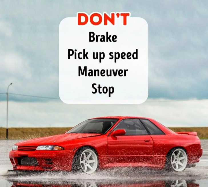 Sie sollten langsamer fahren und ruhig durch jede noch so kleine Pfütze fahren, ohne Ihren Kurs oder Ihr Tempo anzupassen. Bei schneller Fahrt besteht die Möglichkeit, dass Wasser in das Zündsystem eindringt und den Motor abwürgt. Darüber hinaus kann es zu Aquaplaning kommen, das auftritt, wenn ein Auto die Traktion verliert und Sie die Kontrolle darüber verlieren.
