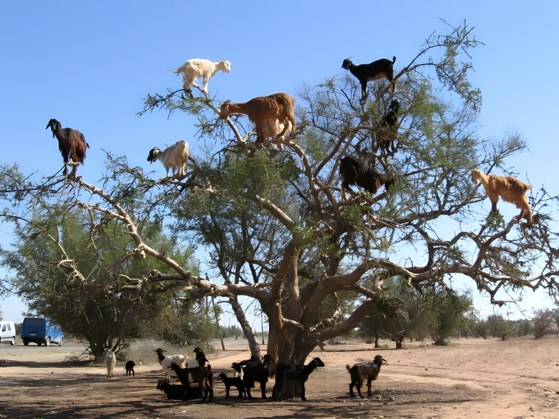 The goats in Morocco are not what make the country unique. The trees are the cause of it. The Argania tree is an uncommon tree that yields nuts so delicious that the goats in the area simply cannot get enough of them. They will even scale the highest branches to harvest the delectable nuts. Goats have excellent balance and are natural climbers. It is not difficult for their cousins, the mountain goats, to climb an average-sized tree because they frequently traverse high cliffs on the narrowest of ledges. Since goats are herd animals, all of the other goats follow the lead goat when he spots an Argania tree. Goats soon fill the tree to the brim.