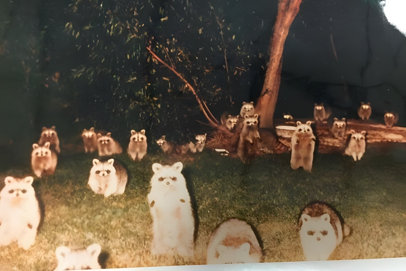 Raccoons are solitary creatures that prefer to live alone, according to Wikipedia. This image begs for clarification! This campsite appears to be the scene of a raccoon party. Since raccoons are nocturnal animals, the majority of their waking hours are spent in the dark. They are opportunistic eaters and omnivores. They are therefore typically seen as a nuisance animal that will destroy gardens and trash cans. It is very important for campers to safeguard their food. Despite having very little hands, raccoons are incredibly skilled at opening boxes and coolers. It’s likely that the woman who snapped this picture outside her tent didn’t have her food safely stored.