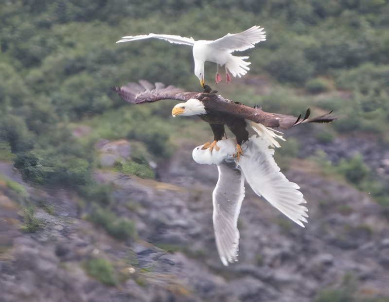 An endearing picture of a seagull attempting to protect his friend from a bald eagle.