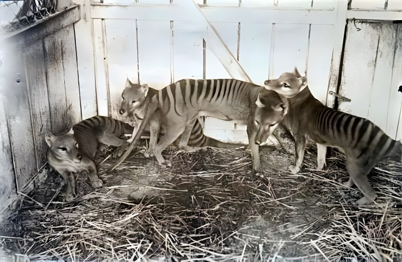 Sadly, this Tasmanian tiger family, photographed in 1910 at the Hobart Beaumaris Zoo, is no longer with us.
