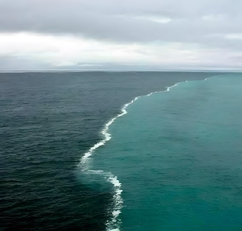 Not all water is created equal. Ocean water varies widely in composition and temperature, and the various types of water don’t usually combine effectively. The fresh water flowing off a glacier melt has a very different viscosity and salinity than the salty seawater of the Gulf of Alaska, as this photo illustrates. Where the two types of water converge but do not mix, a clear line is the outcome.