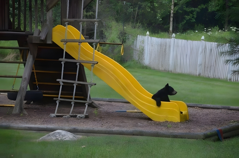 Bears are making their way into backyards and neighborhoods as their natural habitat disappears. It is not strange to see these bears experimenting with the new toys because they are inherently interested. This cute little bear cub has learned how much fun a slide can be. It’s likely that the mother of this young child is nearby, keeping a close eye on her child to ensure his safety. It doesn’t imply she isn’t there just because you can’t see her. Mama bear will be there immediately if she detects danger.