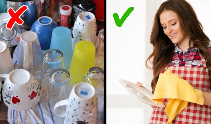 If you dry your dishes upside down, there’s a chance that a musty smell will appear. You can put all items on their sides or just wipe them with paper towels.
