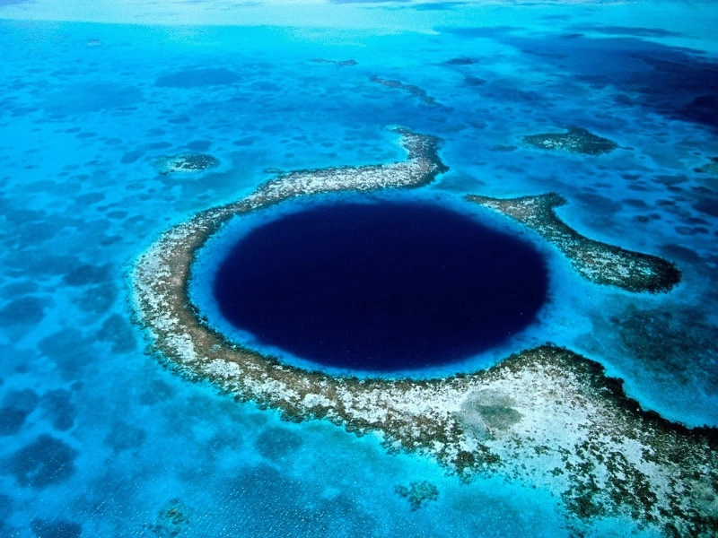 Found all throughout the world, blue holes are underwater sinkholes most known in the Caribbean Sea. Dark blue in hue and apparently limitless depths define these deep, round sinkholes.