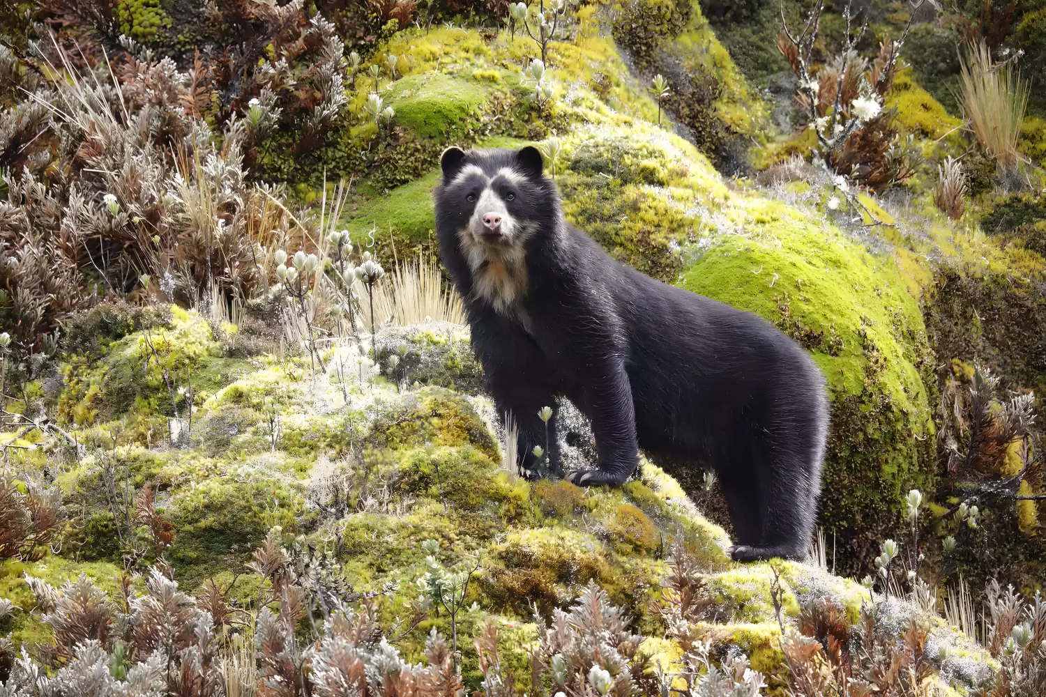 The only species of bear native to South America, the spectacled bear (Tremarctos ornatus) enjoys the mountainous regions of the Andes in Ecuador, Colombia, Venezuela, Peru, and Bolivia, and have even been observed at elevations of 12,000 feet.8 Researchers believe that spectacled bears travel between different types of habitats throughout the year depending on the season, though the timing and drive for these migrations remain unknown. Despite being considered a medium-sized bear, they are one of the largest mammals in South America.