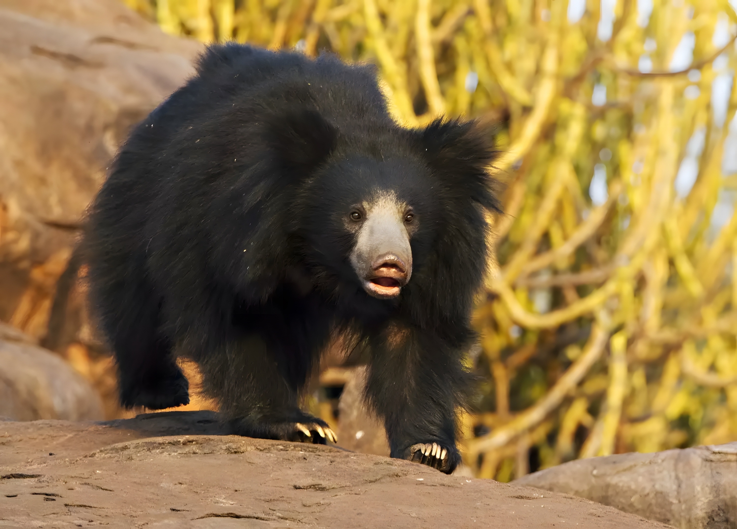 With a name like sloth bear, one might think that these nocturnal bears would be sleepy or slow, but it is actually quite the opposite. Their massive feet and large claws in comparison to the rest of their bodies help sloth bears gallop faster than most humans can run. The name, instead, comes from early explorers, who noticed the dark bears hanging upside down in trees (they are excellent climbers).7 They are also believed to be the original dancing bears, as there are records of nomadic groups in India training sloth bears to perform and entertain crowds throughout history.