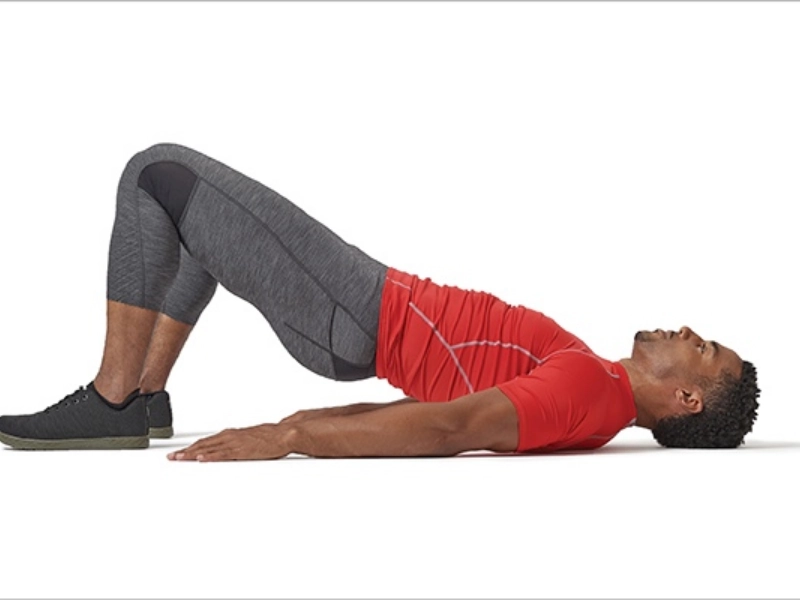 Sitting for long periods of time in an office might deactivate our glutes, which slows down the metabolism—the pace at which our body burns calories. The glute bridge exercise works the buttocks and can loosen up any tightness from extended periods of sitting. Leave your arms by your sides, lift your hips by squeezing your buttock muscles, repeat at the top, and then slowly lower them back down.