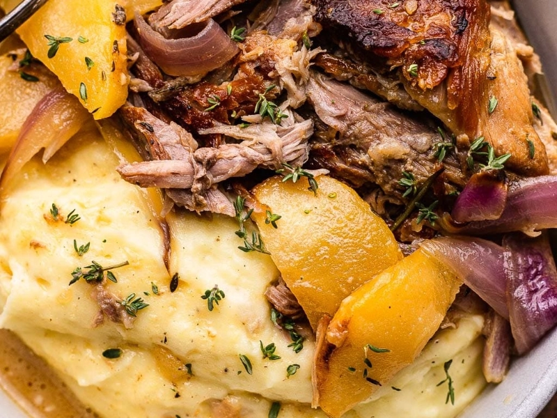 Drizzle apple sauce next, then sprinkle herbs like thyme and rosemary to improve the taste character. The apple sauce accentuates the sweetness to go perfectly with the meat. Reintroduce the pork into the pot, making sure the sauce coats it thoroughly. Cover the saucepan, then let it simmer low for many hours. This slow-cooking technique lets the meat get quite soft and lets the tastes merge together.