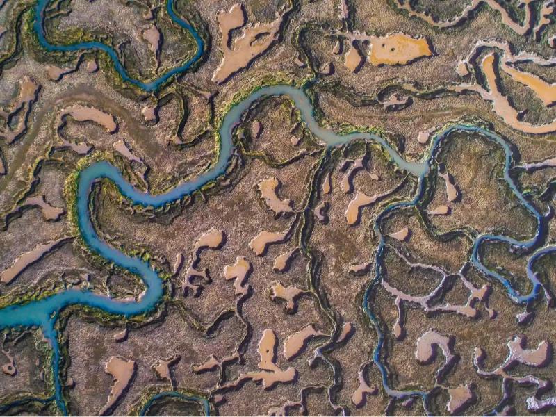One of the most dynamic and common instances of fractal geometry in nature are rivers with their unique meandering forms. River systems develop and grow by a complicated interaction of geological, hydrological, and environmental elements that produces patterns with amazing self-similarity on several sizes. Though it might seem logical that water will flow in straight lines following the path of least resistance, the truth is significantly more interesting and complicated. Rivers’ ability to create meandering, S-shaped bends results from their interaction with the terrain they pass. This process starts with even little perturbations in the river’s flow, including changes in soil composition, the presence of boulders or plants, or modifications brought about by animal activity. Once a little curve develops, it starts a self-reinforcing loop that magnificuates the meandering pattern. Centrifugal force causes water flowing around a bend to accelerate on the outer bank and slow down on the inner bank. Gradually emphasising the curve and producing the characteristic point bars and cut banks seen in mature meanders, this velocity differential causes erosion on the outer bank and deposition on the inner bank.