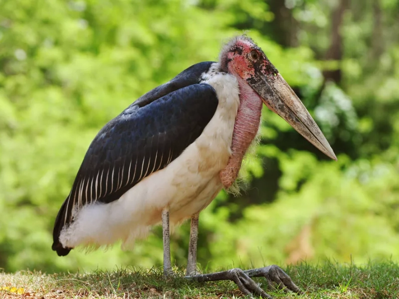 The Marabou Stork’s naked, scabrous head is its most unusual characteristic. The Marabou Stork’s featherless head is an adaptation that lets it consume big carcasses without running the danger of contaminating its feathers with blood and other trash, much as many carrion-eating birds do. For the bird to be a scavenger—a niche it fills with amazing efficiency—this adaptation is very vital. Perfect for cutting into tough hides and accessing the nutrient-rich innards of deceased animals, the Marabou Stork’s strong beak, which can reach lengths of up to 14 inches, is