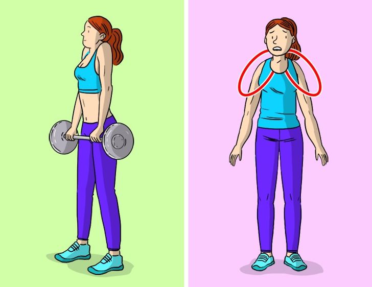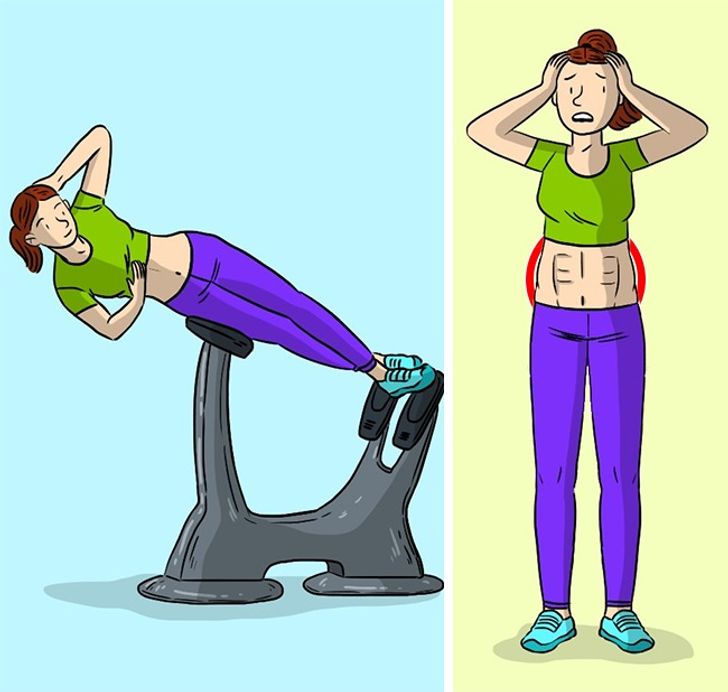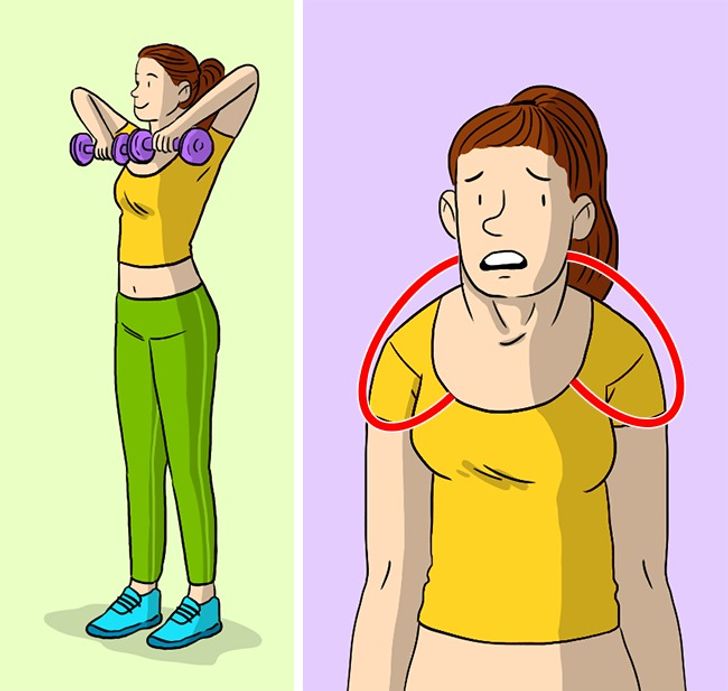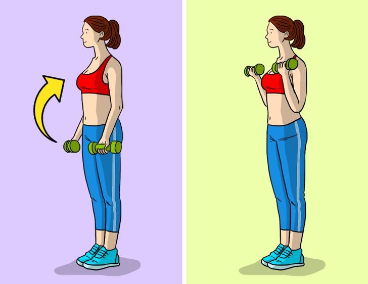 Lena Boone, a bodybuilder and an NPC Sunshine Classic winner, says that one of the most frequent mistakes women make is when they do different bends in the hopes of getting a thinner waist. She calls it “abs abuse.” When bending from side to side with dumbbells, you make your side abs grow. Try to avoid this exercise when working out.
