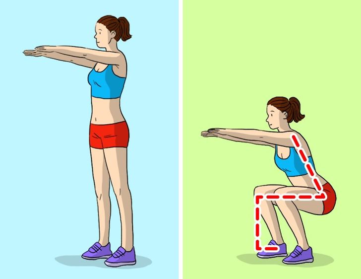 Do squats without weights or with small weights. Make sure that your feet are placed in the right position. Your knees should not go beyond your toes to involve your glutes in the workout.