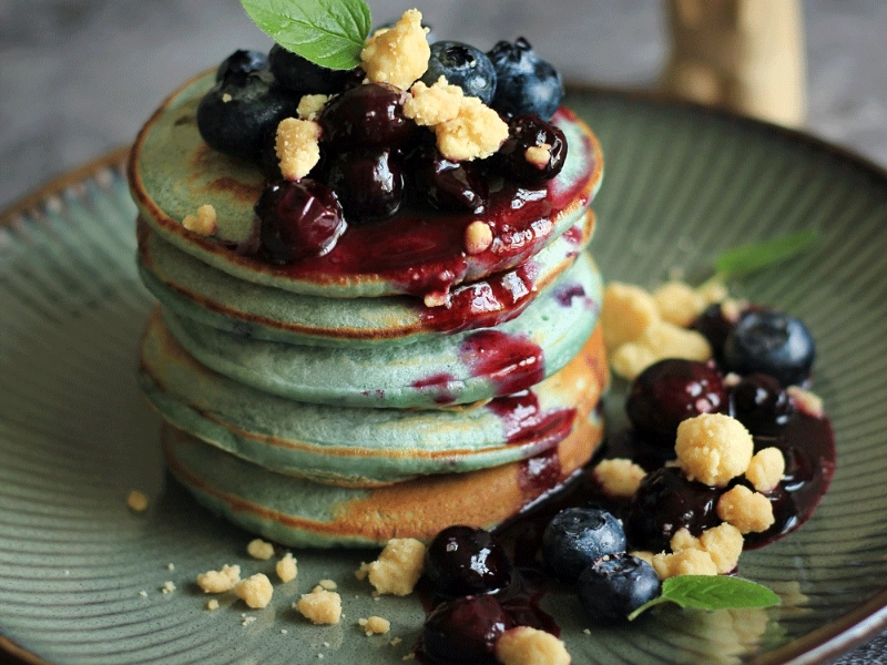 Arrange the small pancakes in a decorative design for the last layer; then, top with fresh blueberries, streusel, and maybe a little powdered sugar. If you’re feeling especially decadent, top with more maple syrup for extra sweetening and a glossy finish.