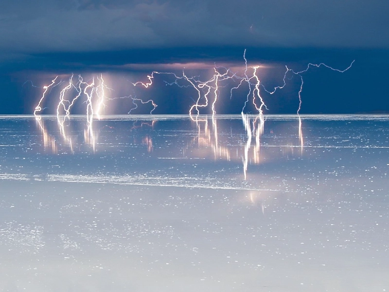 Combining the large expanse of the salt flat with unusual atmospheric conditions at high altitude produces amazing electrical storm displays unlike anywhere else on planet. Unusual electrical field patterns produced by the flat, conductive surface of the salt affect the direction of lightning across the terrain. Visitors can observe amazing lightening displays that seem to dance across the mirror-like surface of the flooded salt flat, generating double images in the reflected water during the wet season, when thunderstorms roll across the salt flat. The great mineral richness and conductivity of the salt flat have been shown to affect the behaviour of electrical discharges, occasionally leading to unusual events such ball lightning and sprite lightning above the flat. The combination of the completely level horizon and the reflective surface enables researchers to view these electrical events from very wide distances, thereby offering special chances to investigate atmospheric electricity and lightning generation.